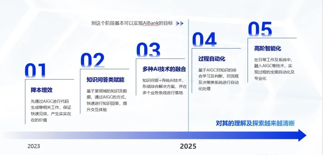 薛春雨表示,大模型在金融行业的落地需要体系化的路径,BB贝博艾弗森官网制定了AIGC五步走战略。首先,通过AIGC降本增效、知识问答类赋能和多种AI技术在业务场景中的融合,通过快速的价值显现,为AIBank战略目标转型夯实基础;其次,在后续的过程中,持续推动自动化和高阶智能化发展,最终实现金融行业的全面智能化。